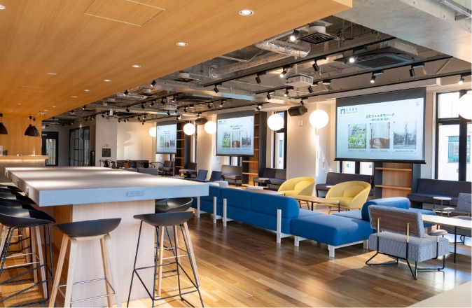 開放的なカフェのような空間で活発なコミュニケーションが自然に生まれるような環境となっております。スクリーンも3面あり、産学官民連携などによるセミナーやネットワークキングなど各種イベントを行えます。